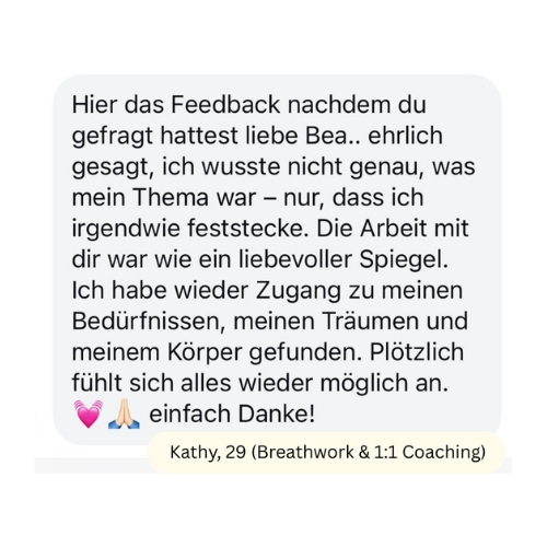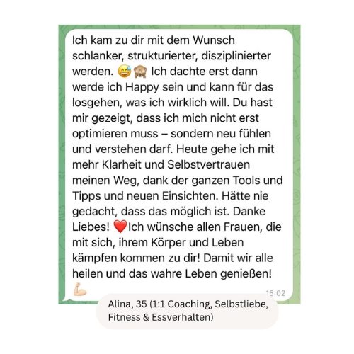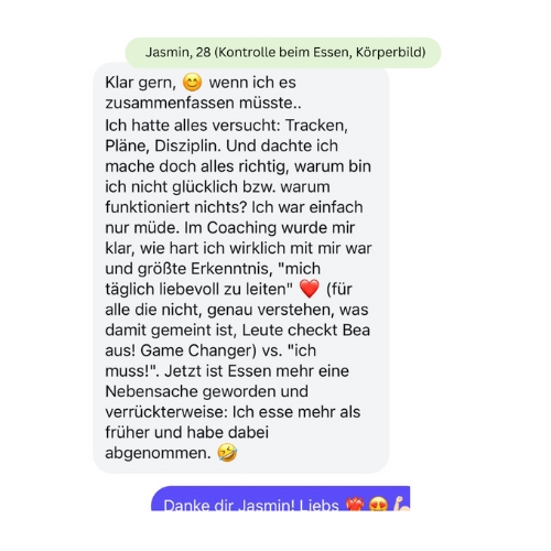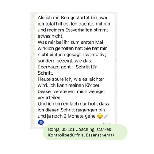 Heute esse ich, wenn ich Hunger habe. Ich höre auf, wenn ich satt bin. Ohne Zwang, ohne Angst. Ich hab so viel mehr Kopf- und Herzfreiheit. Das fühlt sich wie echte Leichtigkeit an. Danke, Bea – du hast mein Verhältnis zu mir selbst verändert. 💕