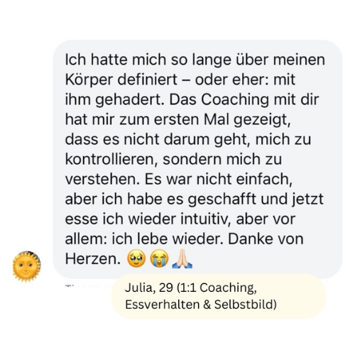 Im Coaching durfte ich mein Essverhalten auf eine ganz neue Weise verstehen – nicht als Problem, sondern als Ausdruck von etwas Tieferem. Wir haben Schritt für Schritt die Kontrolle gegen Vertrauen getauscht.